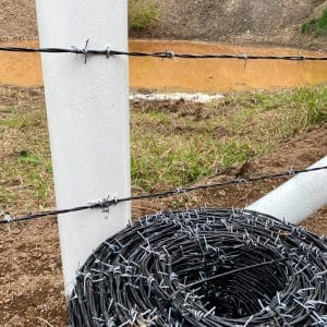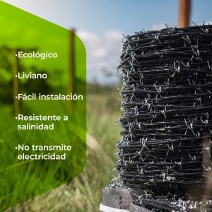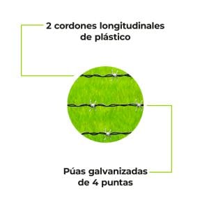 • Alambre de Púas Híbrido trenzado compuesto de dos cordones longitudinales 100% plástico de diámetro promedio de 3.0 mm (sección oval), y púas de cuatro puntas galvanizada sencilla de calibre 12.