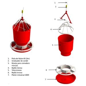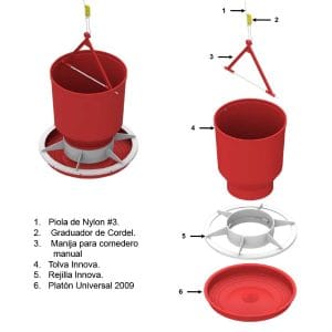 Es un comedero manual especialmente diseñado para uso múltiple que atiende pollo de engorde, pollas de levante, gallinas ponedoras y reproductoras pesadas con solo adaptar un accesorio de acuerdo al tipo de ave que lo va a utilizar.